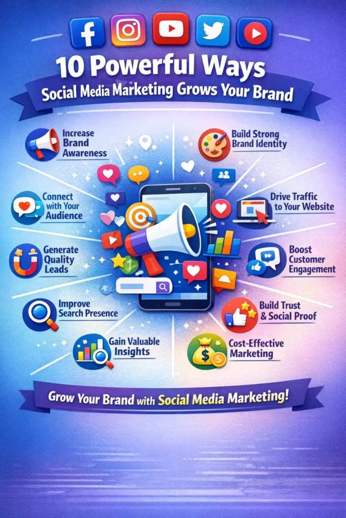 In today’s digital world, social media marketing is one of the most powerful tools to grow your brand. Whether you are a startup, small business, or established company, social media platforms like Instagram, Facebook, LinkedIn, and YouTube help you connect directly with your target audience. With the right strategy, you can increase brand awareness, generate leads, and boost sales. Here are 10 powerful ways social media marketing helps grow your brand. 1. Increases Brand Awareness The first and most important benefit of social media marketing is brand awareness. Millions of people use social media daily. When you consistently post valuable content, more people discover your brand. By sharing engaging posts, reels, stories, and videos, you make your brand visible to a larger audience. The more people see your brand, the more they remember it. Over time, this builds recognition and trust. 2. Builds Strong Brand Identity Social media allows you to showcase your brand personality. You can use your brand colors, logo, tone of voice, and content style to create a consistent image. For example, if your brand is professional, you can share informative posts and industry insights. If your brand is fun and creative, you can post entertaining and interactive content. This consistency helps customers understand who you are and what you stand for. 3. Connects You Directly with Your Audience One of the biggest advantages of social media marketing is direct communication. Customers can comment on your posts, send messages, and ask questions. This interaction builds trust and improves customer relationships. When you reply to comments and messages quickly, customers feel valued. Strong engagement leads to customer loyalty and long-term brand growth. 4. Drives Targeted Traffic to Your Website Social media is a powerful source of website traffic. You can share blog links, product pages, landing pages, and offers directly on your profile. With proper call-to-action (CTA) like “Visit our website” or “Shop now,” you can guide users to your website. More traffic means more chances for leads and sales. Paid ads on platforms like Facebook and Instagram also help target specific audiences based on age, location, and interests. 5. Generates Quality Leads Social media platforms offer advanced targeting options. You can run lead generation ads to collect email addresses, phone numbers, and inquiries. For example, LinkedIn is excellent for B2B leads, while Instagram and Facebook work well for B2C businesses. By sharing valuable content and offers, you attract people who are genuinely interested in your services. This improves conversion rates and increases revenue. 6. Boosts Customer Engagement Engagement is the heart of social media marketing. Likes, comments, shares, and saves show that people are interacting with your content. You can increase engagement by posting polls, quizzes, questions, contests, and live videos. High engagement improves your visibility because social media algorithms promote content that people interact with. More engagement means more reach and faster brand growth. 7. Improves Search Engine Presence Although social media is not a direct ranking factor for Google, it supports your overall SEO strategy. When your content is shared widely, it increases brand searches and website visits. Active social profiles also appear in search engine results. When someone searches for your brand name, your social media pages often show up. This improves credibility and strengthens your online presence. 8. Builds Trust and Social Proof People trust brands that others recommend. Social media helps you showcase testimonials, reviews, and user-generated content. When customers tag your brand or share positive feedback, it acts as social proof. New customers are more likely to trust your brand when they see others having a good experience. Trust is a key factor in growing any brand successfully. 9. Provides Valuable Customer Insights Social media platforms provide detailed analytics. You can track reach, engagement, clicks, and audience demographics. These insights help you understand what type of content works best. You can identify your target audience’s age, gender, location, and interests. With this data, you can improve your strategy and create more effective campaigns. Better decisions based on data lead to faster brand growth. 10. Cost-Effective Marketing Strategy Compared to traditional marketing like TV, radio, or print ads, social media marketing is highly affordable. You can start with organic content and grow your brand without spending a large budget. Even paid ads are flexible. You can start with a small budget and increase it as you see results. This makes social media marketing ideal for startups and small businesses looking to grow quickly without high costs.